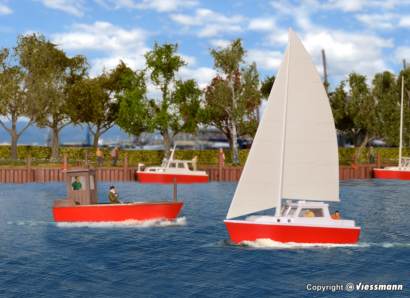 H0 Set Boote - Kibri 39159 - Bausatz. Das Set besteht aus 4 Ruder-, 2 Motor- und 2 Segelbooten. L 5,0 x B 1,7 x H 2,8 cm / L 5,0 x B 1,7 x H 1,0 cm L 5,3 x B 1,7 x H 7,5 cm. Keine Figuren inkludiert. Für Magnorail müssen Sie noch die Schleifer dazu bestellen.