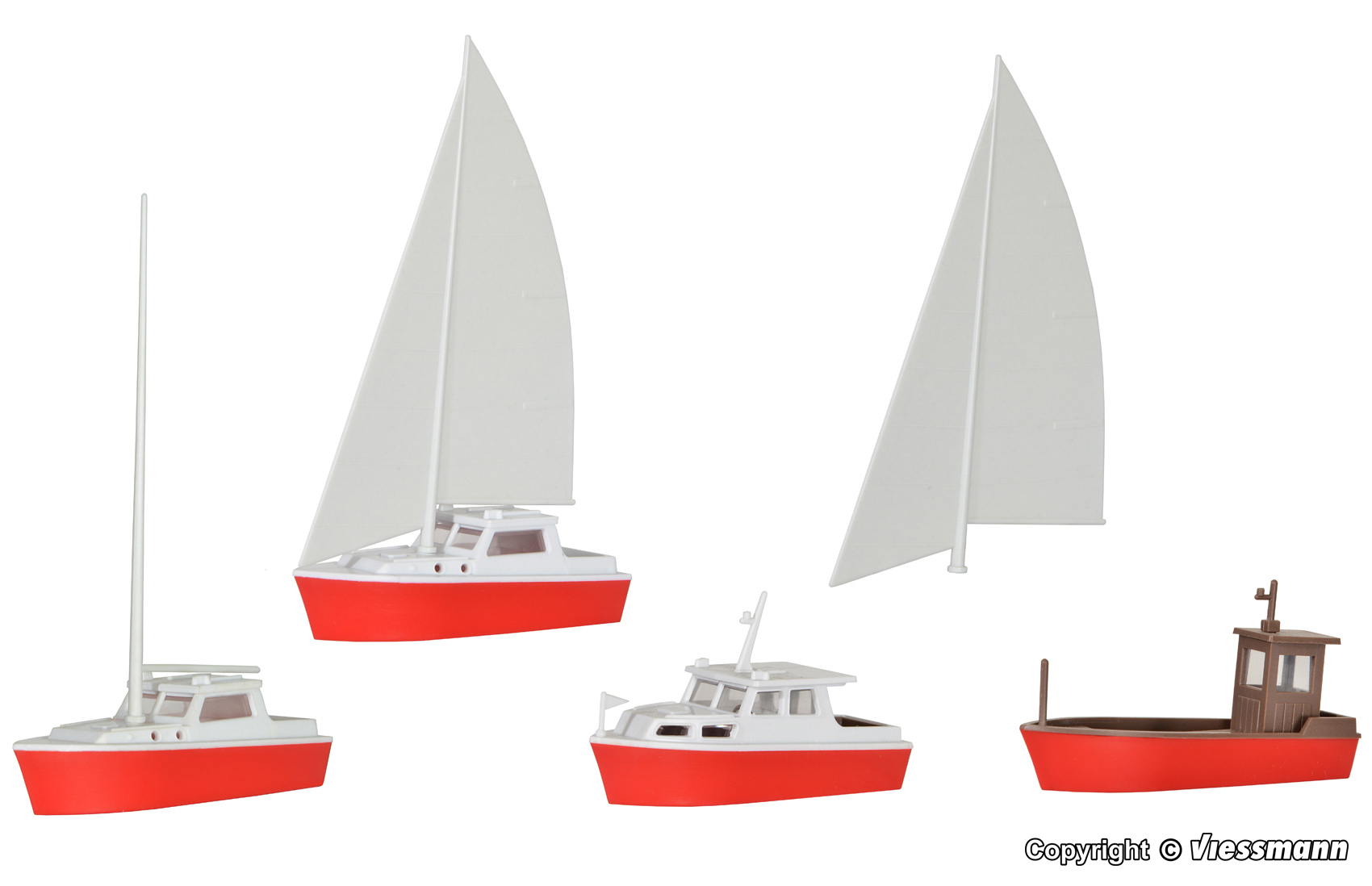 H0 Set Boote - Kibri 39160- Bausatz. Das Set besteht aus 2 Segelbooten, Motorjacht und Arbeitsboot. L 7,0 x B 2,5 x H 4,0 ? 10,5 cm. Keine Figuren inkludiert. Für Magnorail müssen Sie noch die Schleifer dazu bestellen.